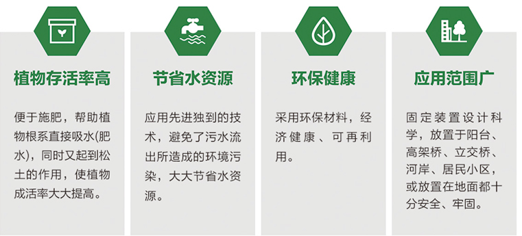 改變傳統(tǒng)的單株載種為多株整合狀栽種,以整體的美感營(yíng)造出典雅大氣的視景,室內(nèi)外皆宜,造型簡(jiǎn)潔美觀、新穎大方,可結(jié)合當(dāng)?shù)貍鹘y(tǒng)文化來(lái)設(shè)計(jì),增強(qiáng)親和力。它具有儲(chǔ)水和自動(dòng)排水的功能,無(wú)泄漏、無(wú)污染、清潔環(huán)保,能避免大雨后積水而造成植物爛根。